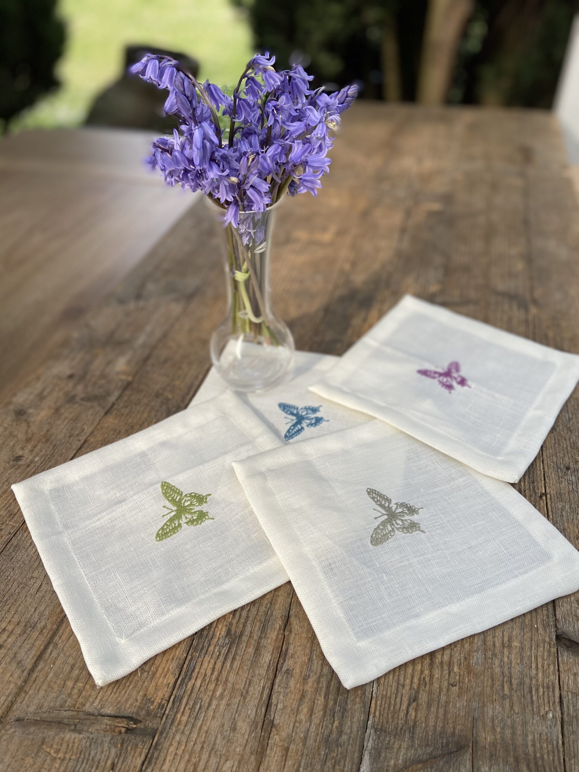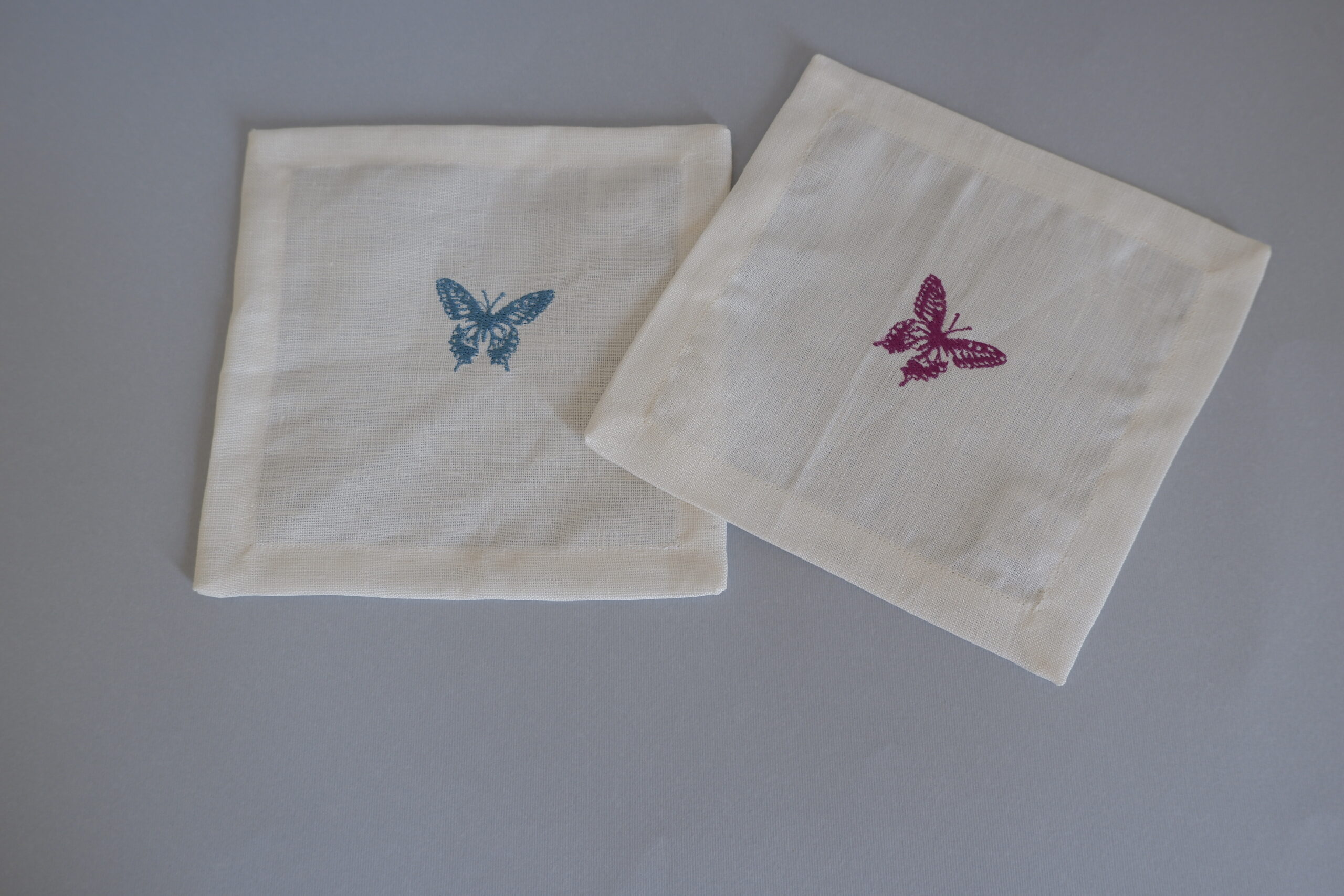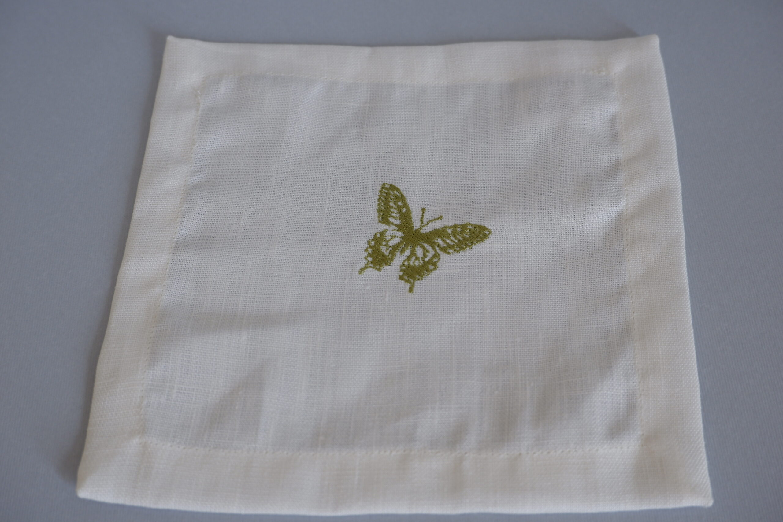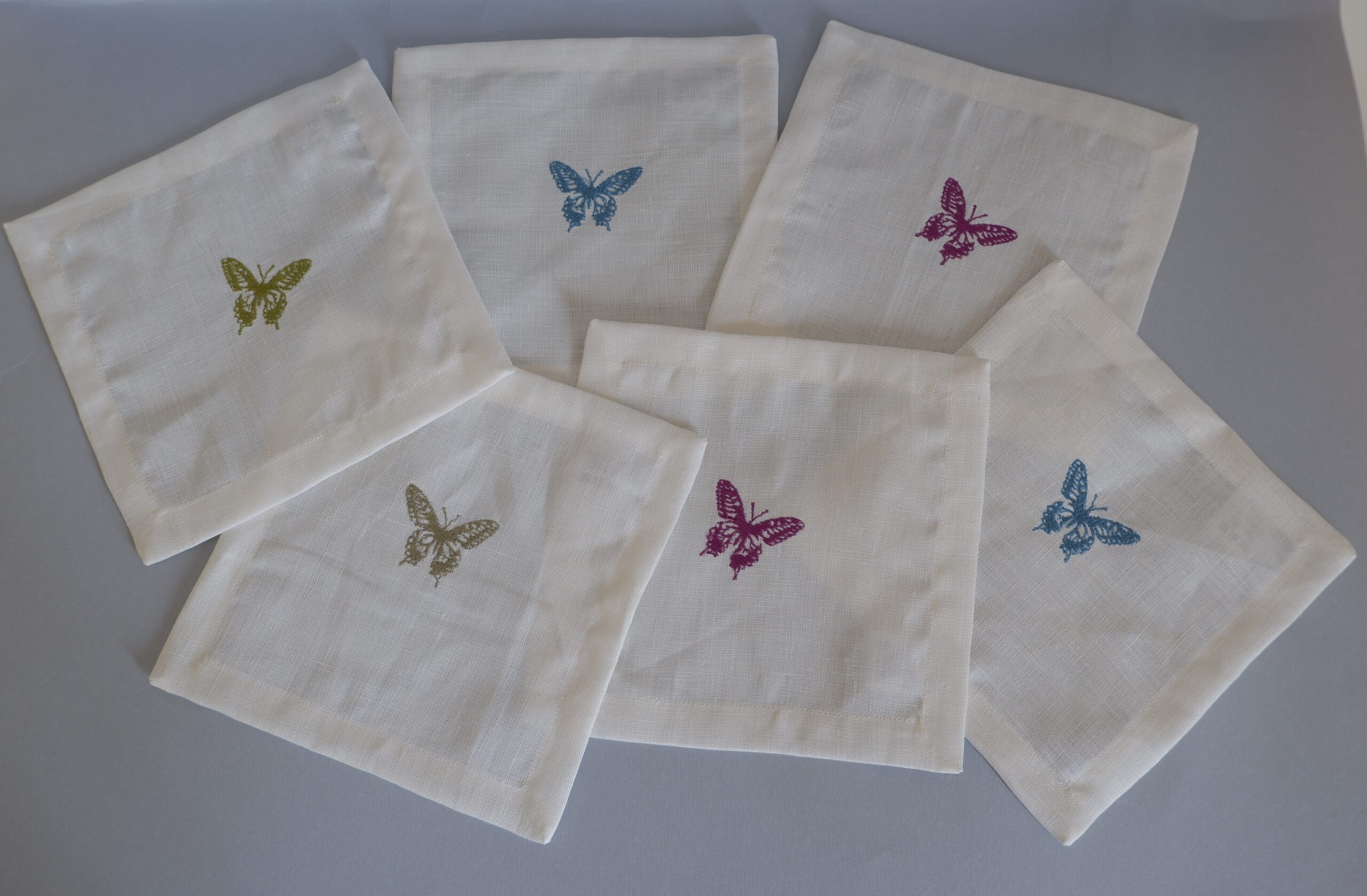 Siamo entusiasti di presentare le bellissime farfalle ricamate nella nostra collezione di tovaglie. Realizzato in puro lino francese e manifattura in Italia, splendidamente incorniciato da un bordo con cappuccio con farfalle di diversi colori. Questo set di sei morbidi tovaglioli bianco antico completerà il tuo cocktail - caffè con amici e familiari.